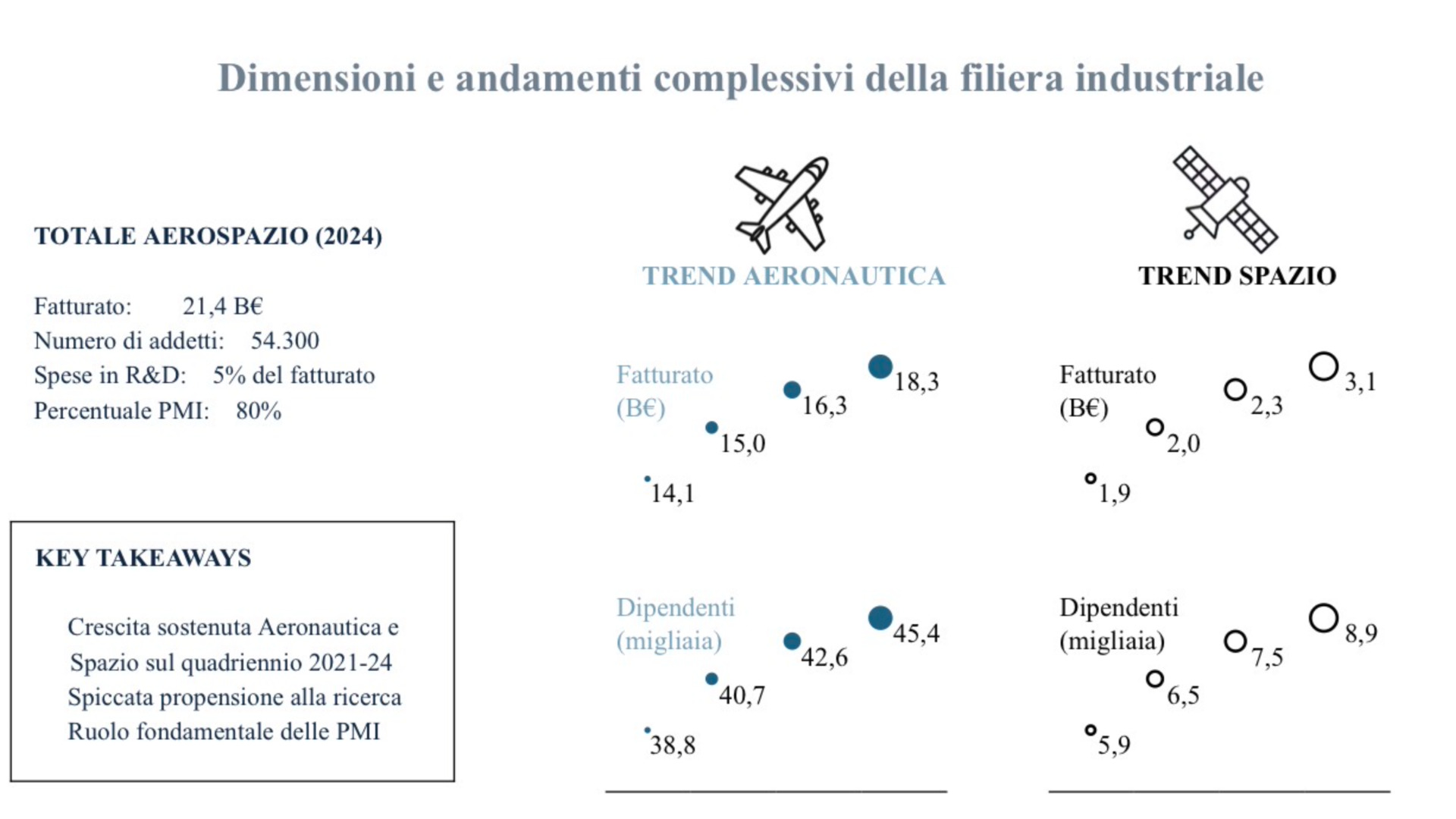 Il settore, infatti, si presenta come un’infrastruttura industriale distribuita sul territorio nazionale: Campania, Lazio, Lombardia e Piemonte concentrano il 74% degli addetti aeronautici; Lazio, Lombardia e Piemonte ospitano l’81% degli addetti nel segmento spaziale. Il campione analizzato comprende 38 grandi imprese, 220 pmi, 18 startup, 38 enti di ricerca e 24 università.