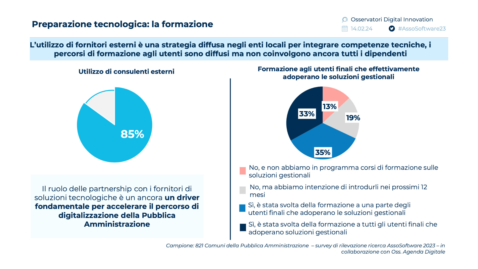 “Introdurre soluzioni software, integrarle e mantenerle richiede competenze tecniche e di governance dell’Information technology non semplici da reperire e internalizzare. Oggi, l’85% dei Comuni dichiara di affidarsi ai fornitori di software per sopperire a una mancanza di competenze tecniche interne. In questo contesto, il ruolo della filiera italiana del software diventa centrale nel percorso di digitalizzazione della Pa: queste aziende detengono buona parte delle competenze tecniche del Paese e sono in grado di trasferirle al cliente, diventandone un partner chiave”, afferma Pierfrancesco Angeleri, presidente di AssoSoftware. “Tuttavia, per perseguire un utilizzo maturo delle soluzioni gestionali e favorire un reale cambiamento delle modalità di lavoro è necessario formare innanzitutto gli utilizzatori. Le persone vanno guidate nel cambiamento, formate all’utilizzo delle soluzioni nel proprio quotidiano e rese consapevoli dei benefici ottenibili da nuove modalità di gestire le proprie attività”.