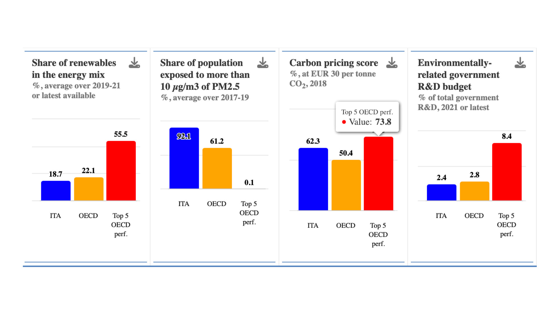 Secondo l’Ocse l’Italia resta indietro anche su altri fronti. La transizione climatica è altrettanto importante della transizione tecnologica (e spesso ad essa correlata) ,ma l’Italia ha prestazioni inferiori ai Paesi più avanzati in termini di riduzione delle emissioni, impiego delle fonti rinnovabili, diffusione di ricerca e sviluppo e quota di Pil dedicata ai temi green. E intanto “l’inquinamento, in particolare al Nord, è elevato”, afferma lo studio.