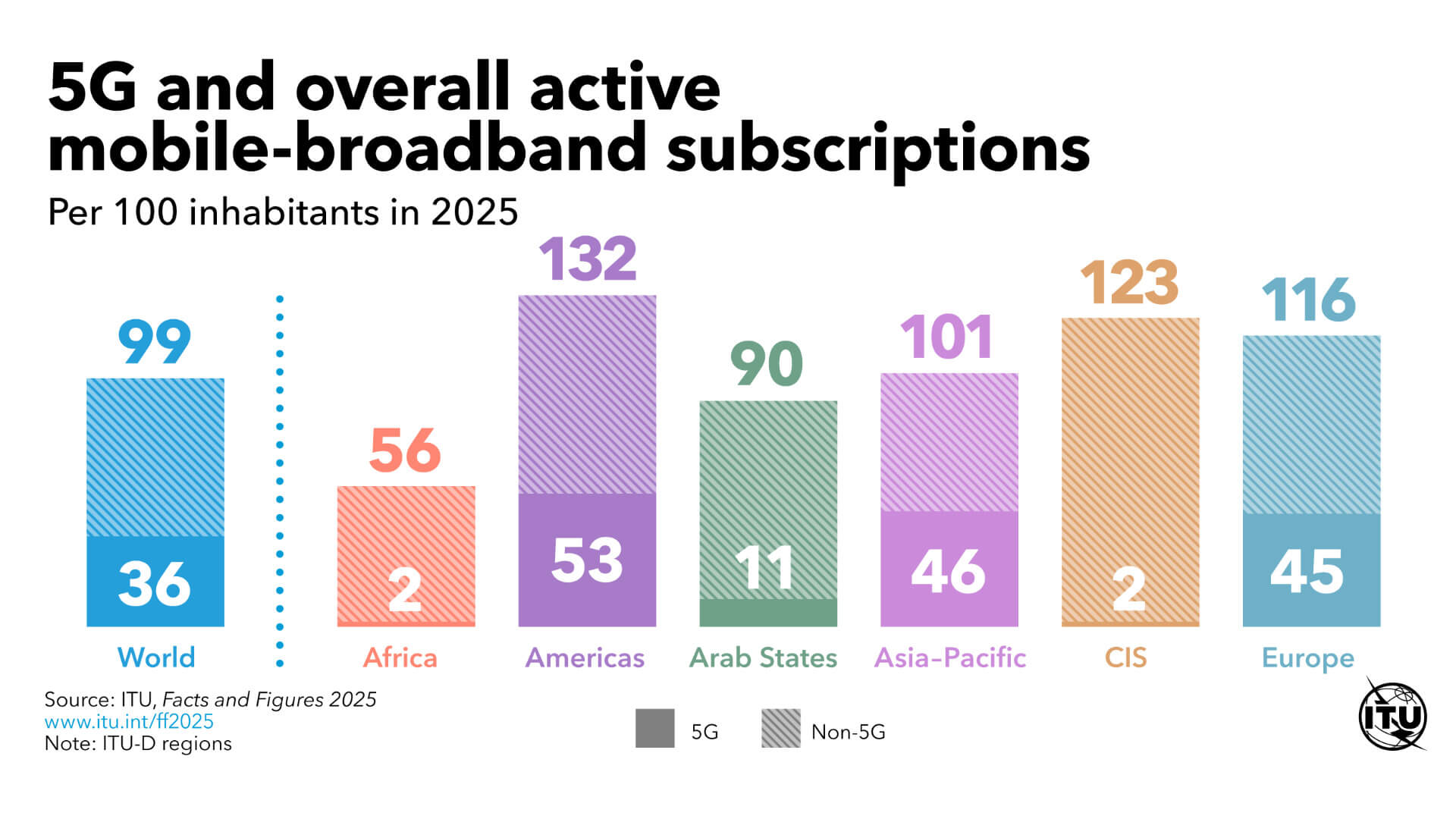 Per la prima volta, Facts and Figures dell’Itu stima il numero totale di abbonamenti 5G, che ora rappresentano circa un terzo, ovvero circa 3 miliardi, di tutti gli abbonamenti alla banda larga mobile nel mondo.