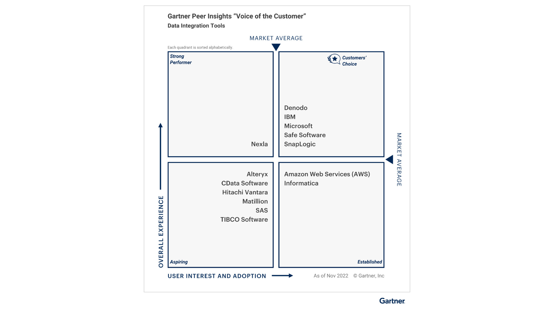 Denodo, Ibm, Microsoft, Safe Software e SnapLogic, ovvero i fornitori collocati nel quadrante in alto a destra e riconosciuti come Gartner Peer Insights Customers’ Choice, soddisfano o superano sia l’esperienza complessiva media di mercato che l’interesse e l’adozione degli utenti medi.