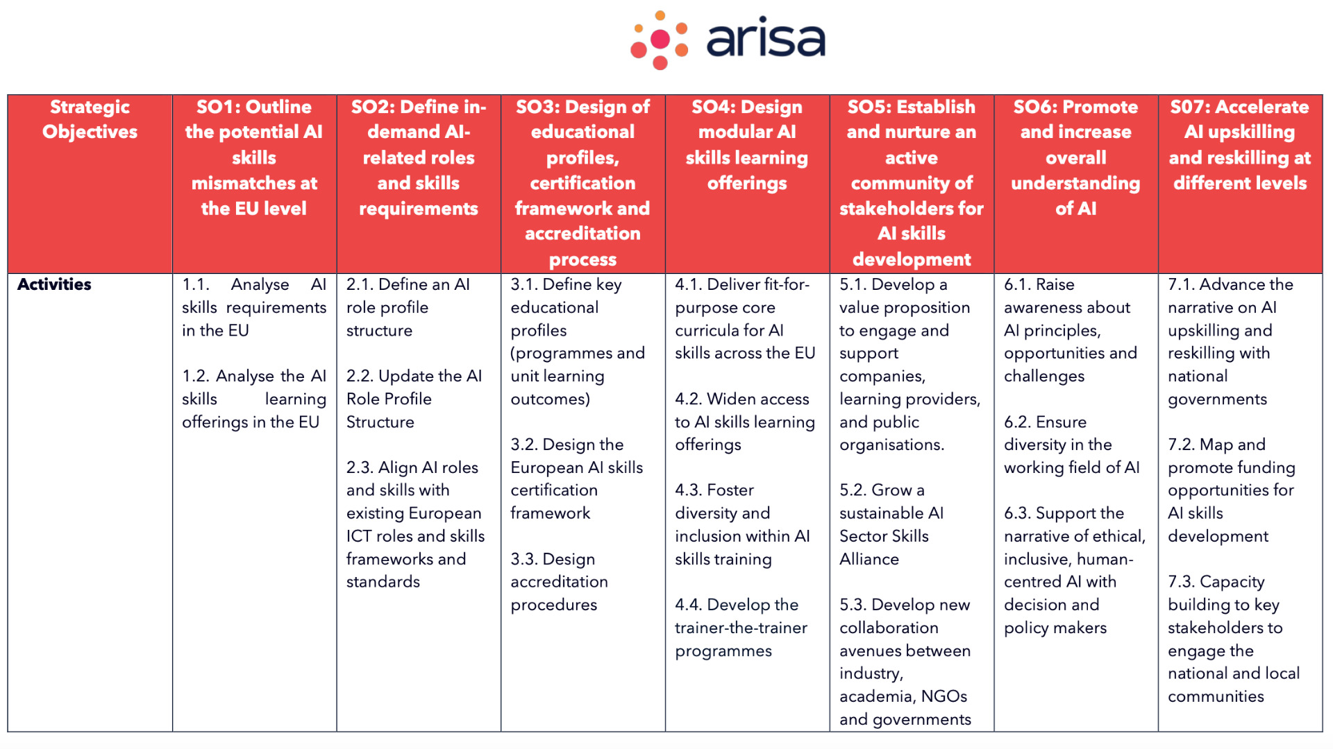 Arisa raggruppa i principali organismi rappresentativi delle Ict, del mondo della formazione e altri stakeholder al fine di formare competenze e ridurre lo skill gap nell’Ai. Il suo primo compito è stato lo sviluppo – con il sostegno dell’Ue – della “Ai Skills Strategy for Europe” basata sui nuovi requisiti di competenze per le persone nelle professioni legate all’Ai.