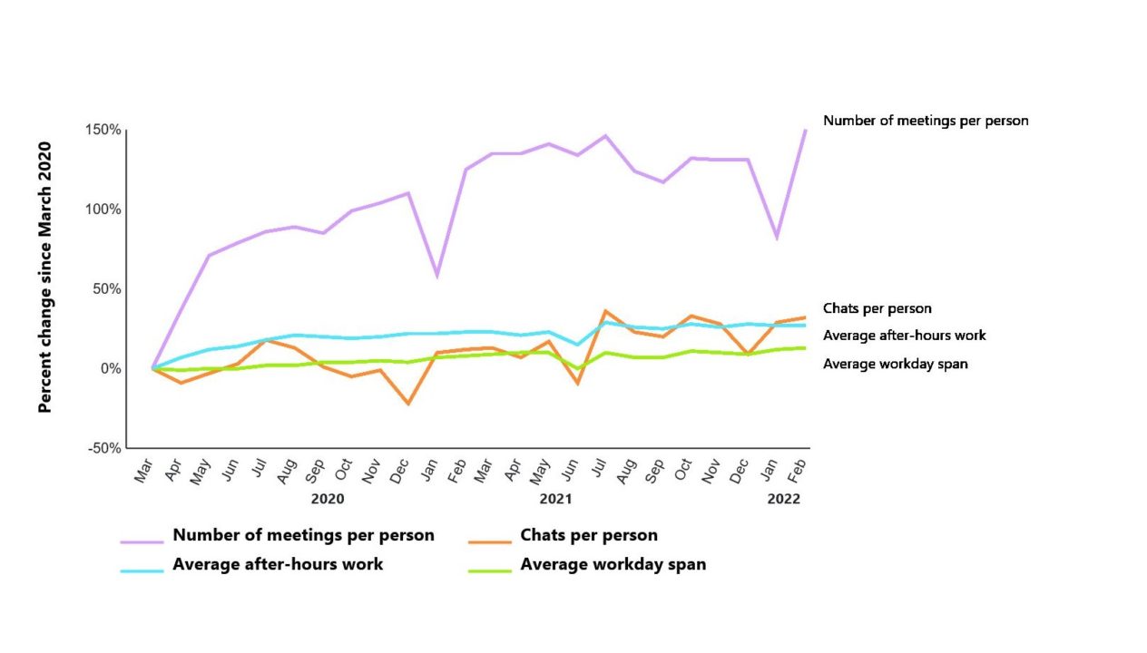 L’analisi dei dati di produttività in Microsoft 365 dimostra che le riunioni e le chat sono in aumento, spesso estendendosi oltre il tradizionale orario lavorativo. Infatti, la media settimanale di tempo trascorso in riunioni su Teams a livello globale è aumentata del 252% da marzo 2020, e il lavoro extra-time e nel fine settimana è cresciuto rispettivamente del 28% e del 14%. “Se da una parte è sicuramente stimolante vedere come le persone sono state in grado di rimodellare la propria giornata per soddisfare le esigenze lavorative e personali”, commenta Microsoft, “dall’altra bisogna far sì che il lavoro flessibile diventi anche sostenibile e rispetti alcuni limiti. Per questa ragione saranno necessarie delle nuove norme a livello aziendale per regolare il lavoro ibrido o da remoto”.