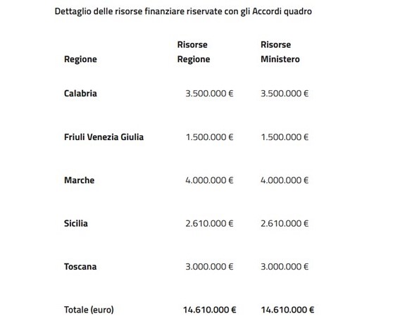 A seguito della chiusura dei termini per la sottoscrizione degli Accordo quadro di cui all’articolo 4, del decreto direttoriale 14 novembre 2022, le risorse finanziarie disponibili per il territorio nazionale ammontano ad euro 485.390.000,00, di cui: euro 165.032.600,00 riservati ai progetti di ricerca e sviluppo da realizzare nei territori delle regioni del Mezzogiorno.