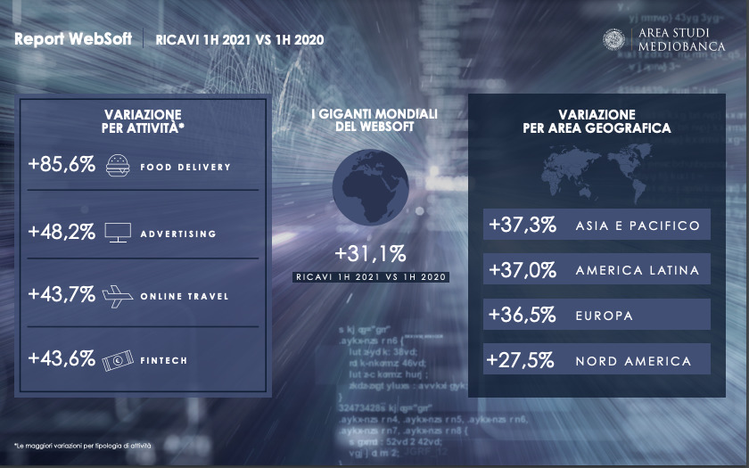 Le websoft presidiano l’Italia tramite società controllate ubicate in gran parte nelle province di Milano e Monza-Brianza, per un fatturato aggregato di tutte le filiali che nel 2020 ha raggiunto i 4,6 miliardi di euro, occupando oltre 13mila lavoratori. Il comparto nazionale si inserisce in un contesto che, a livello globale, nel primo semestre 2021 vede una crescita del fatturato aggregato a doppia cifra del +31,1% sul 2020, uniforme a livello geografico con Asia & Pacifico, America Latina ed Europa in accelerazione del +37% e Nord America, già ampiamente presidiata dai colossi del websoft, in crescita del +28%.