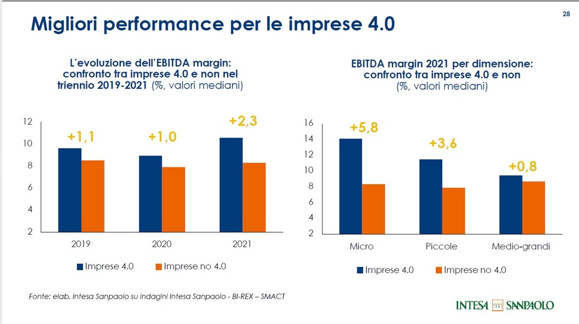 I vantaggi della tecnologia sono evidenti in termini di redditività e produttività. Da un’analisi su 423 imprese localizzate nel Triveneto, in Emilia- Romagna e nelle Marche, in gran parte attive in settori ad alta intensità distrettuale come Meccanica, Agro-alimentare e Legno-arredo, tra le imprese 4.0 emerge la miglior dinamica dell’Ebitda margin, che si è rafforzato tra il 2019 e il 2021. Si è così ampliato il divario rispetto alle altre aziende, che invece hanno subito un ridimensionamento del proprio mark up. Le differenze maggiori si osservano per le imprese più piccole: nel 2021 quelle 4.0 hanno registrato un Ebitda margin pari al 14%; il resto delle micro imprese si è fermato all’8%.