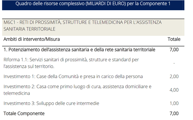 La prima componente della missione – stanziati 7 miliardi – punta alla realizzazione delle reti di prossimità, strutture intermedie e telemedicina per l’assistenza sanitaria territoriale. Gli interventi di questa componente intendono rafforzare le prestazioni erogate sul territorio grazie al potenziamento e alla creazione di strutture e presidi territoriali (come le Case della Comunità e gli Ospedali di Comunità), il rafforzamento dell’assistenza domiciliare, lo sviluppo della telemedicina e una più efficace integrazione con tutti i servizi socio-sanitari. Per questa ultima azione sono previste risorse pari a 4 miliardi.