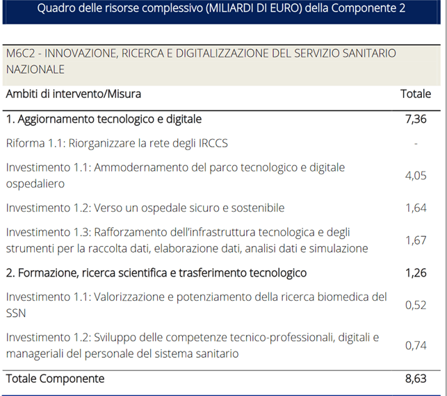 L’investimento prevede l’ammodernamento digitale del parco tecnologico ospedaliero, tramite l’acquisto di 3.133 nuove grandi apparecchiature ad alto contenuto tecnologico (Tac, risonanze magnetiche, Acceleratori Lineari, Sistema Radiologico Fisso, Angiografi, Gamma Camera, Gamma Camera/Tac, Mammografi, Ecotomografi) caratterizzate da una vetustà maggiore di 5 anni, sia con interventi finalizzati al potenziamento del livello di digitalizzazione di 280 strutture sanitarie sede di Dipartimenti di emergenza e accettazione (Dea) di I e II livello. Inoltre, l’intervento (attuativo dell’art. 2 del decreto legge n. 34/2020) prevede il rafforzamento strutturale degli ospedali del Ssn, attraverso l’adozione di un piano specifico di potenziamento dell’offerta ospedaliera.