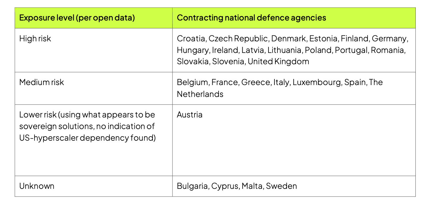 L’Italia rientra tra i Paesi classificati a rischio medio. Negli ultimi anni, il Ministero della Difesa ha migrato numerosi sistemi verso il Polo Strategico Nazionale, presentato come pilastro del Cloud sovrano Ue. Il report osserva però che il Psn utilizza tecnologie Google Assured Workload e Oracle Alloy.