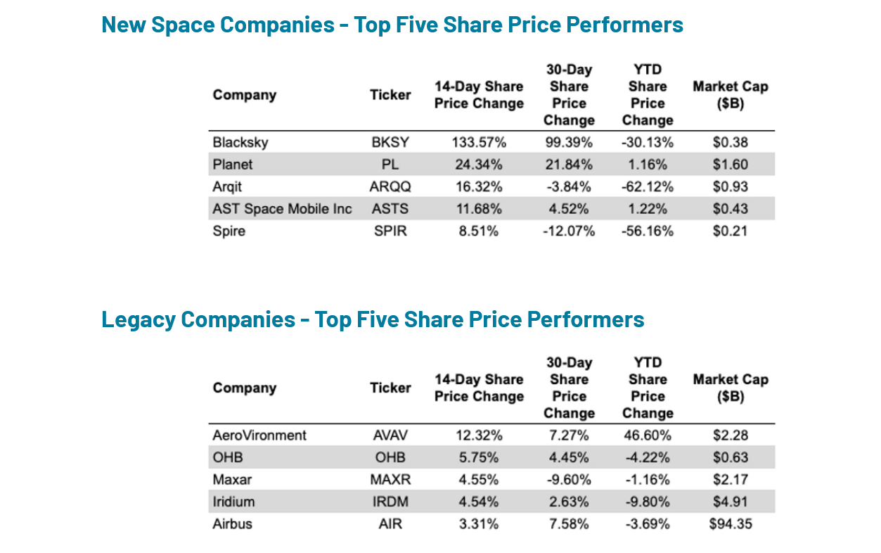 Nell’Indice sono mappate tutte le società New Space quotate di recente, a partire da Virgin Galactic nel 2020, ed esclusivamente quelle che hanno una capitalizzazione di mercato di da 500 milioni di dollari in su anche se sono previste “eccezioni”. Man mano che altri leader New Space inizieranno a negoziare pubblicamente attraverso altri metodi come Ipo tradizionali o quotazioni dirette, saranno incluse anche queste entità. Metriche come la crescita storica dei ricavi saranno prese in considerazione per includere società, con una certa discrezionalità se la crescita dei ricavi è superata da fattori qualitativi. L’Indice viene ribilanciato trimestralmente il secondo lunedì di gennaio, aprile, luglio e ottobre. Di seguito le nuove società spaziali più performanti nell’Indice, dal punto di vista del prezzo delle azioni, nelle ultime due settimane, seguite dalle prime cinque società Space Legal
