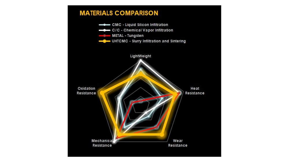 Nel nostro caso parliamo di tutta la gamma di materiali che sono in grado di resistere a temperature sino ed otre i 2.000 C°, come quelle che si registrano sui veicoli spaziali quando entrano o escono dall’atmosfera. Ma parliamo anche di componenti per motori a reazione o bordi alari per veicoli supersonici. I materiali tradizionali sono stati messi a punto attorno agli anni ’60, funzionano bene ma sono costosi e hanno una durata breve. Potremmo parlare in generale di componenti “usa e getta” o con prestazioni inferiori, comunque non in linea con le recenti richieste di performance e sostenibilità. Quando oggi sentiamo parlare di componenti riutilizzabili non ci si riferisce infatti a materiali innovativi, ma a materiali tradizionali che vengono trattati con ulteriori tecnologie di nuova generazione, ad esempio con sistemi di refrigerazione che consentono loro di durare più a lungo. Noi siamo diversi, vogliamo vendere materiali innovativi con caratteristiche native di resistenza e durevolezza a calore, ossidazione, sollecitazioni meccaniche e usura.