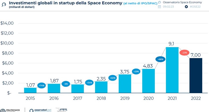Riguardo agli investimenti nella startup a livello globale il 2022 è stato un anno al ribasso: le startup della Space Economy hanno raccolto 8 miliardi di euro, un rallentamento dopo l’exploit del biennio precedente (con quasi 14 miliardi di euro raccolti 2021), dovuto all’instabilità geopolitica, la crisi dei mercati finanziari e alla frenata delle operazioni di Spac (Special Purpose Acquisition Company), che sono state regolate nel febbraio 2022. Al netto delle operazioni di Spac gli investimenti risultano organicamente stabili.