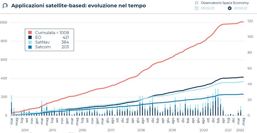 Il settore dell’Osservazione della Terra è il più rappresentato nelle applicazioni satellite-based (prodotti e servizi che utilizzano dati provenienti da satelliti elaborati da tecnologie digitali). Oggi se ne contano 421, la maggioranza delle 1008 censite a livello mondiale, seguite da applicazioni di Navigazione satellitare (384) e di Comunicazione satellitare (203).