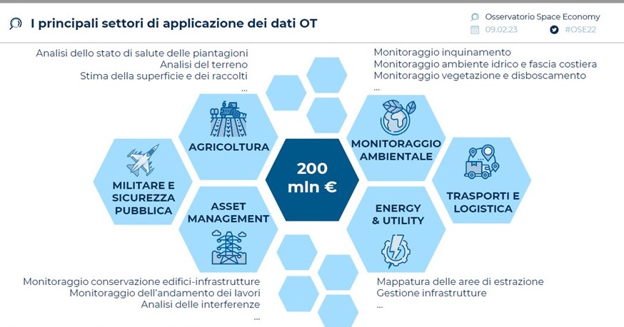 Il 65% del fatturato complessivo del mercato dell’Osservazione della Terra è legato a enti pubblici nazionali o sovranazionali, Agenzie Spaziali ed Enti pubblici locali come Regioni, Province e Comuni. Il restante 35% è invece imputabile alla domanda proveniente da grandi imprese, pmi e startup che stanno per prime investendo in Osservazione della Terra. I principali ambiti di applicazione riguardano diversi settori: da agricoltura a silvicoltura e pesca, da energia a servizi di pubblica utilità, edilizia e infrastrutture, da finanza, assicurazioni, comparto legale e ambiente a wildlife.