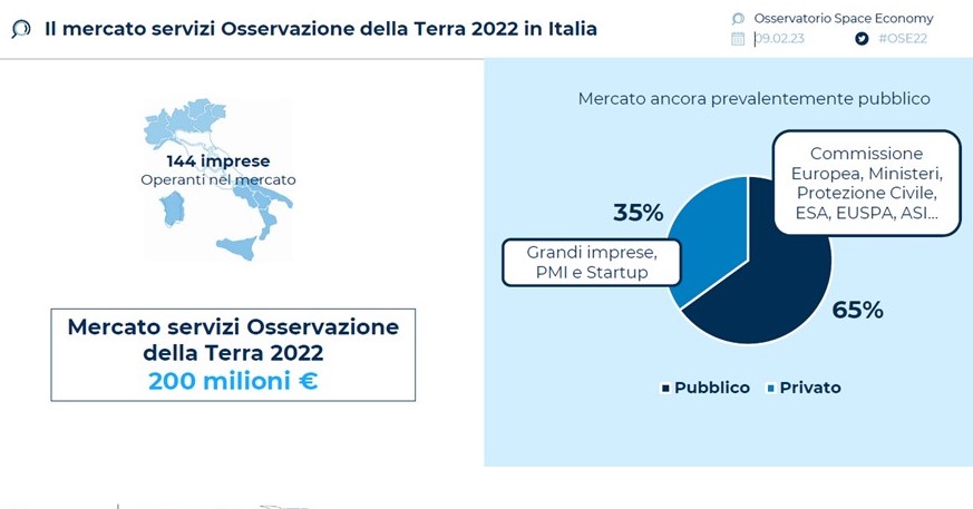 Secondo l’Osservatorio il 2022 è stato l’anno del consolidamento per la Space economy italiana: si sono poste le basi per il decollo dei prossimi anni. Tra il 2021 e il 2027, il bilancio complessivo dell’Europa destinato al settore è di 14,8 miliardi di euro, la somma più alta mai stanziata dall’Ue per lo Spazio, in un mercato della Space Economy sempre più in crescita: a livello mondiale si attesta attorno ai 100 miliardi di dollari, guidato dagli Stati Uniti con 62 miliardi di dollari di investimenti e un budget Nasa ai 24 miliardi di dollari per il 2022.