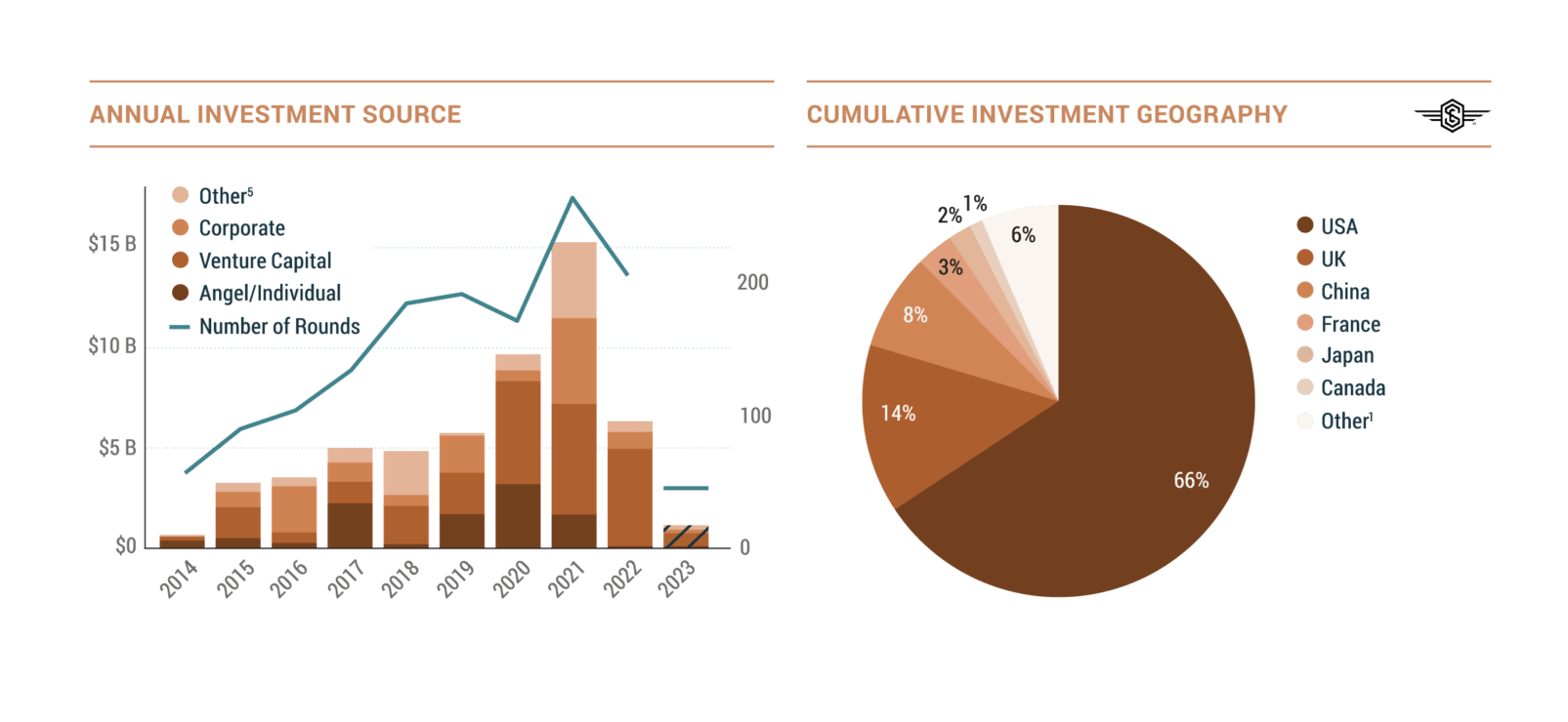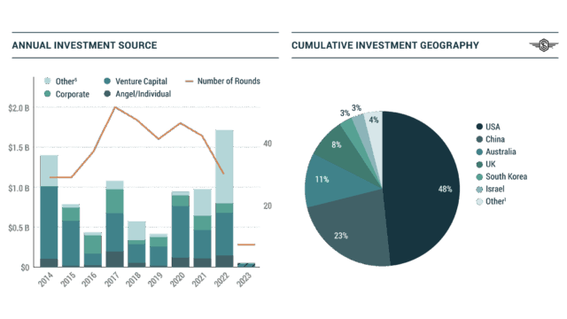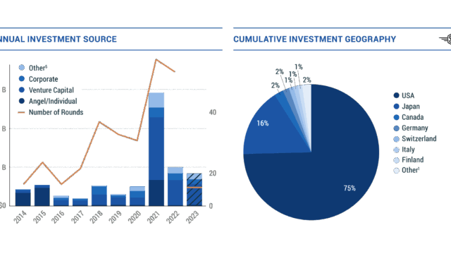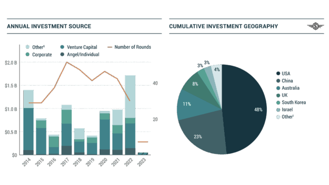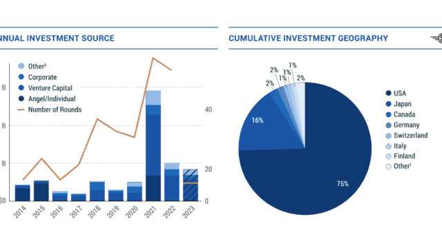 Con altri 0,4 miliardi di dollari investiti nel primo trimestre, dal 2014 sono stati investiti 3,7 miliardi in 134 società uniche nelle industrie emergenti, ma non operanti nel settore dei lanci e dei satelliti. Gli investitori venture capital hanno contribuito per il 51% del totale, mentre gli “Angel investors” (gli investitori informali) hanno rappresentato un altro 22%. Al di là di ogni aspettativa, il primo trimestre 2023 è stato un terzo trimestre record per questo comparto, che ha fatto segnare l’84% del totale dell’intero 2022, mentre gli investitori di capitale di rischio sono stati il 63% del totale del primo trimestre.