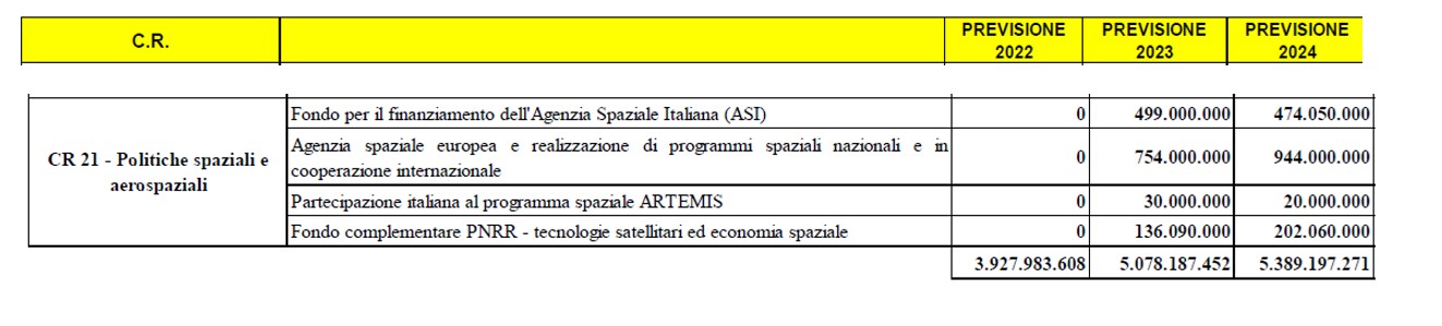 A fronte di tale aumento, tuttavia, risultano in diminuzione le risorse destinate al Fondo per il finanziamento dell’Asi che passano da 499 milioni di euro a 474 milioni, nonché i fondi destinati a sostenere la partecipazione italiana al programma spaziale Artemis, che passano da 30 milioni a 20 milioni di euro.
