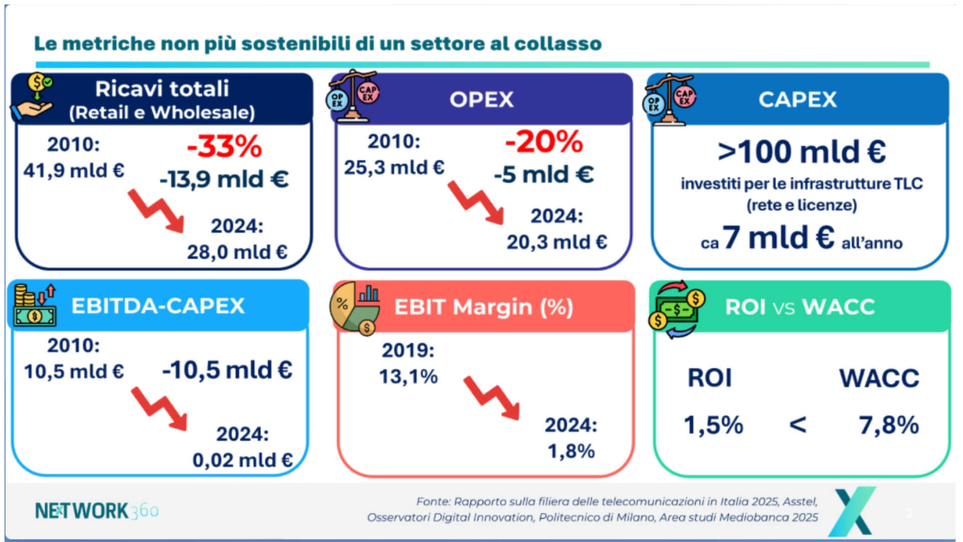 I numeri sono drammatici: in 15 anni il settore delle Tlc ha bruciato il 33% dei ricavi totali (da 41,9 miliardi a 28 miliardi di euro) a fronte di un’esplosione dei volumi di dati – nessuna filiera ha perso tanto.