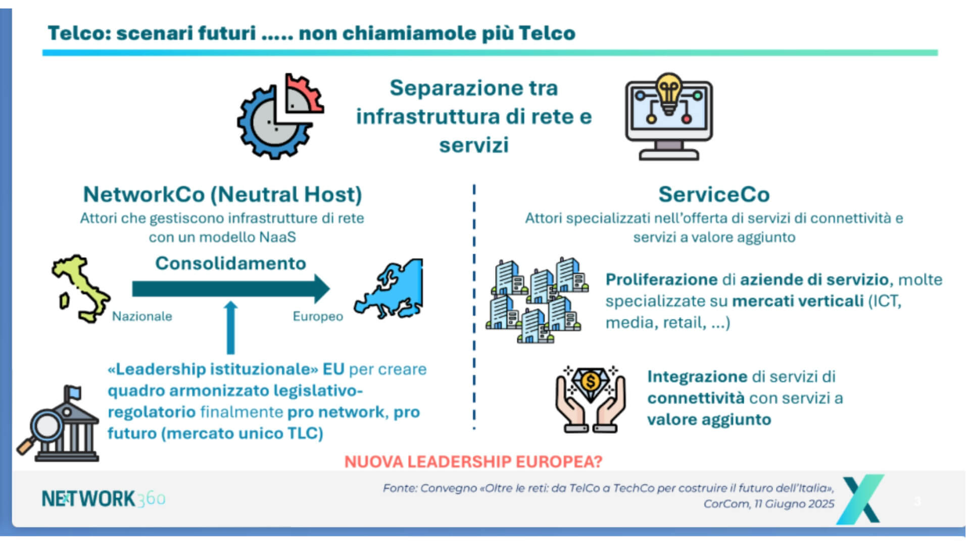 Da un lato, dunque, devono esserci le NetworkCo come reti neutrali e consolidamento del settore: su questo Rangone è stato chiaro, l’Ue è un unicum rispetto ad altre regioni del mondo, con una pletora di operatori e una sfibrante guerra dei prezzi. Ora serve una “nuova leadership europea” che rilanci un settore nato in Europa e che rappresenta la forza del nostro continente. La competizione continuerà a giocarsi sui servizi con le ServiceCo, ma la rete deve essere unica, consolidata.
