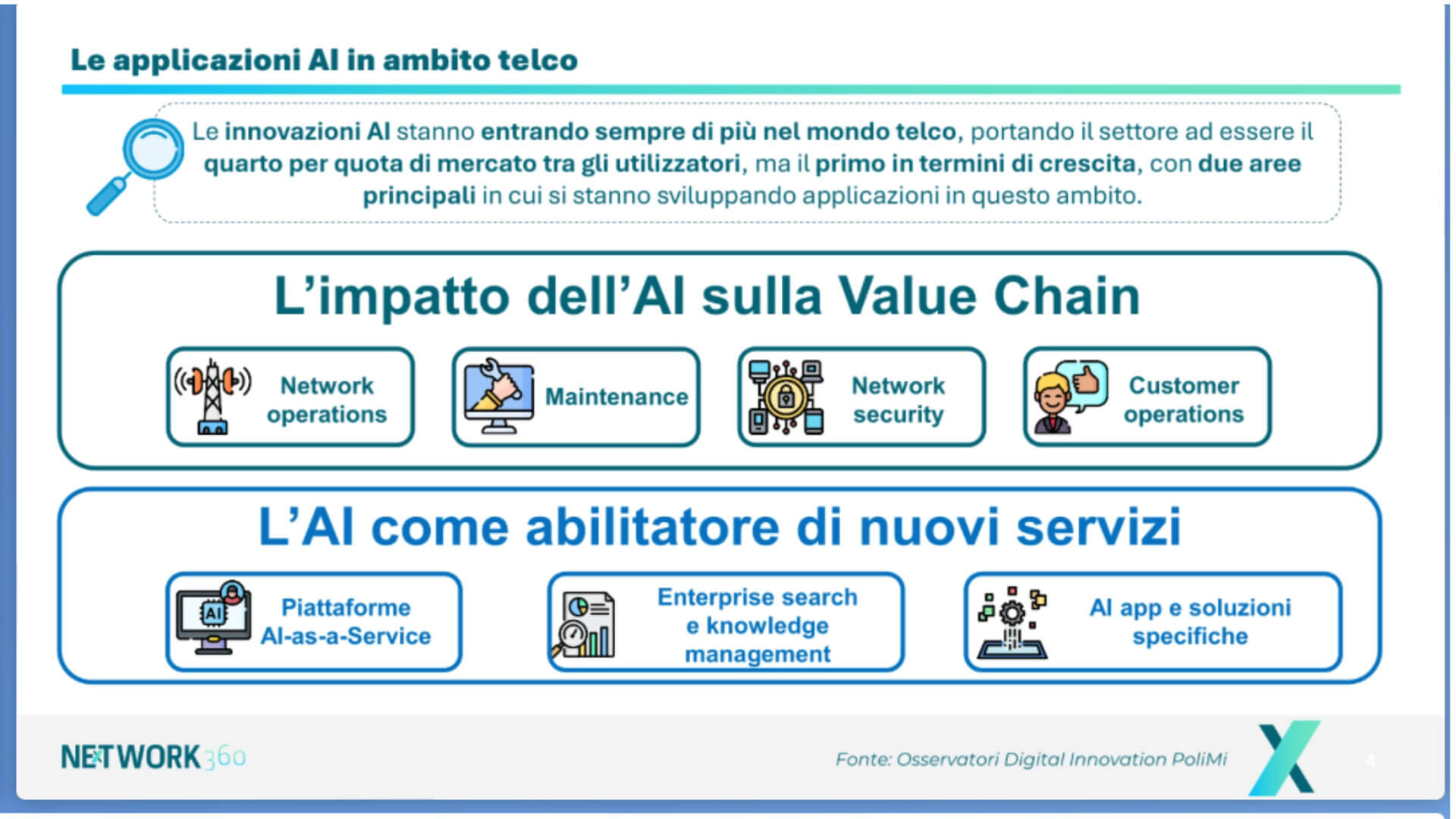 Ma già le telco stanno sfruttando efficacemente l’Ai e molto potranno ottenere nel prossimo futuro. Due le possibili aree di impatto: l’Ai sulla value chain e l’Ai sui servizi che le telco erogano agli utenti finali.