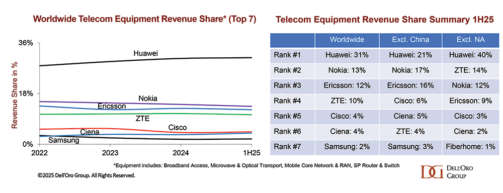 La classifica dei fornitori globali è rimasta sostanzialmente invariata, sebbene le quote di fatturato abbiano registrato una modesta variazione, con Huawei che ha continuato a guadagnare terreno, mentre Ericsson e Nokia hanno registrato lievi cali rispetto ai livelli del 2024.